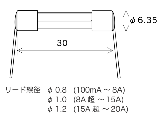 PSEマーク AC250V 普通溶断 6.35×30mm リード付管形ヒューズ