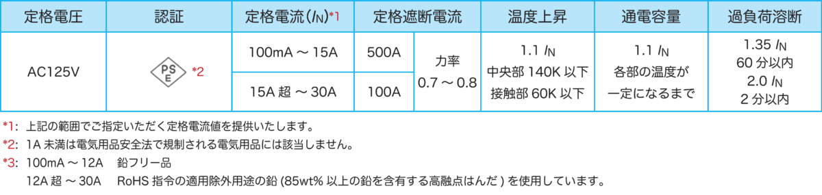 PSEマーク AC125V 耐ラッシュ 6.35×30mm リード付管形ヒューズ